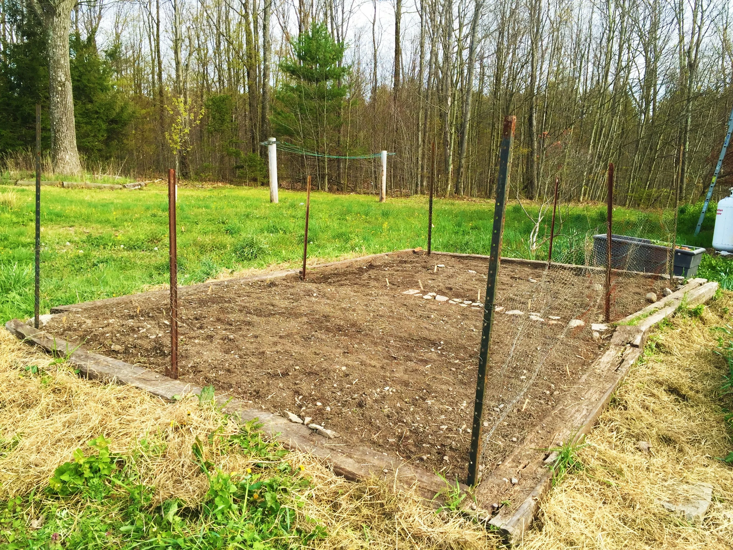 Those of you who do know how to build a fence are probably shocked that this paltry thing was the result of four hours of work, and will notice a few shortcomings: The posts are uneven in height because I got the post driver (a brilliant tool that I didn't know existed) after I had already tied the chicken wire to the four corner posts. If you inspected the metal wires more closely, you would find that they are a hodge podge of ties, and my "gate" is more of an intentional opening than a gate. Regardless, it should help to keep the cats out, at least for a day or two.